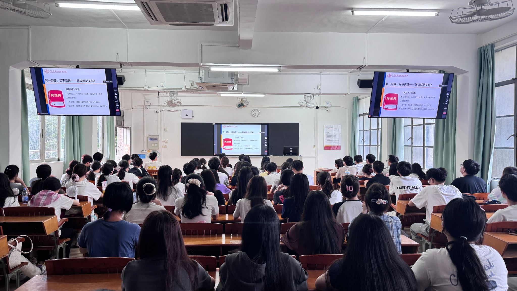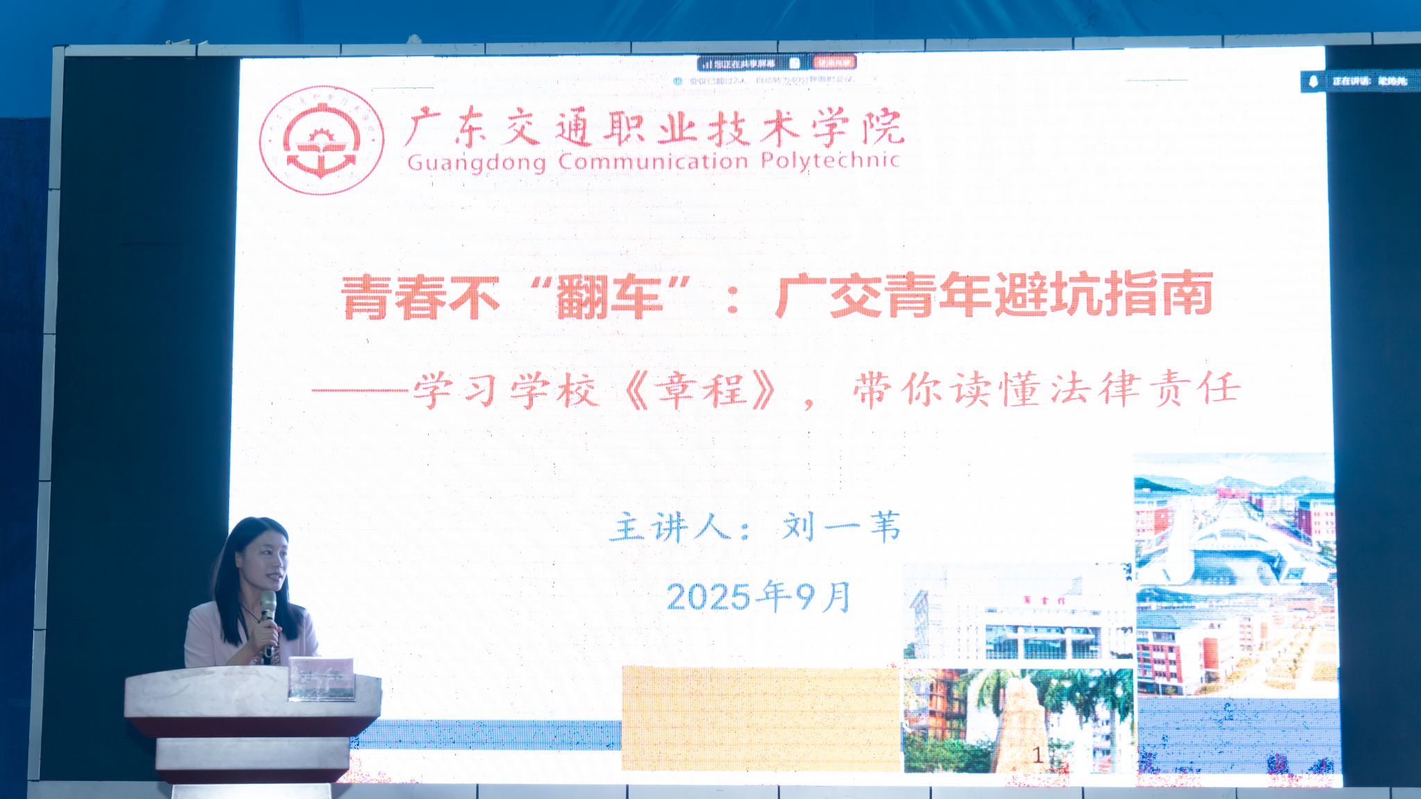 为提升青年学子的法律素养和风险防范能力,9月17日,学院团委副书记刘一苇以“青春不‘翻车’:广交青年法律风险防控指南”为题,面向运输与经济管理学院花都校区700余名新生开展以学习《广东交通职业技术学院章程》、读懂法律责任为主要内容的法治教育专题讲座,通过解读学院《章程》中的权责条款,结合真实案例剖析,为青年学子提供了系统化的法律风险识别与规避方案,有效强化了学生的法治思维与责任意识。