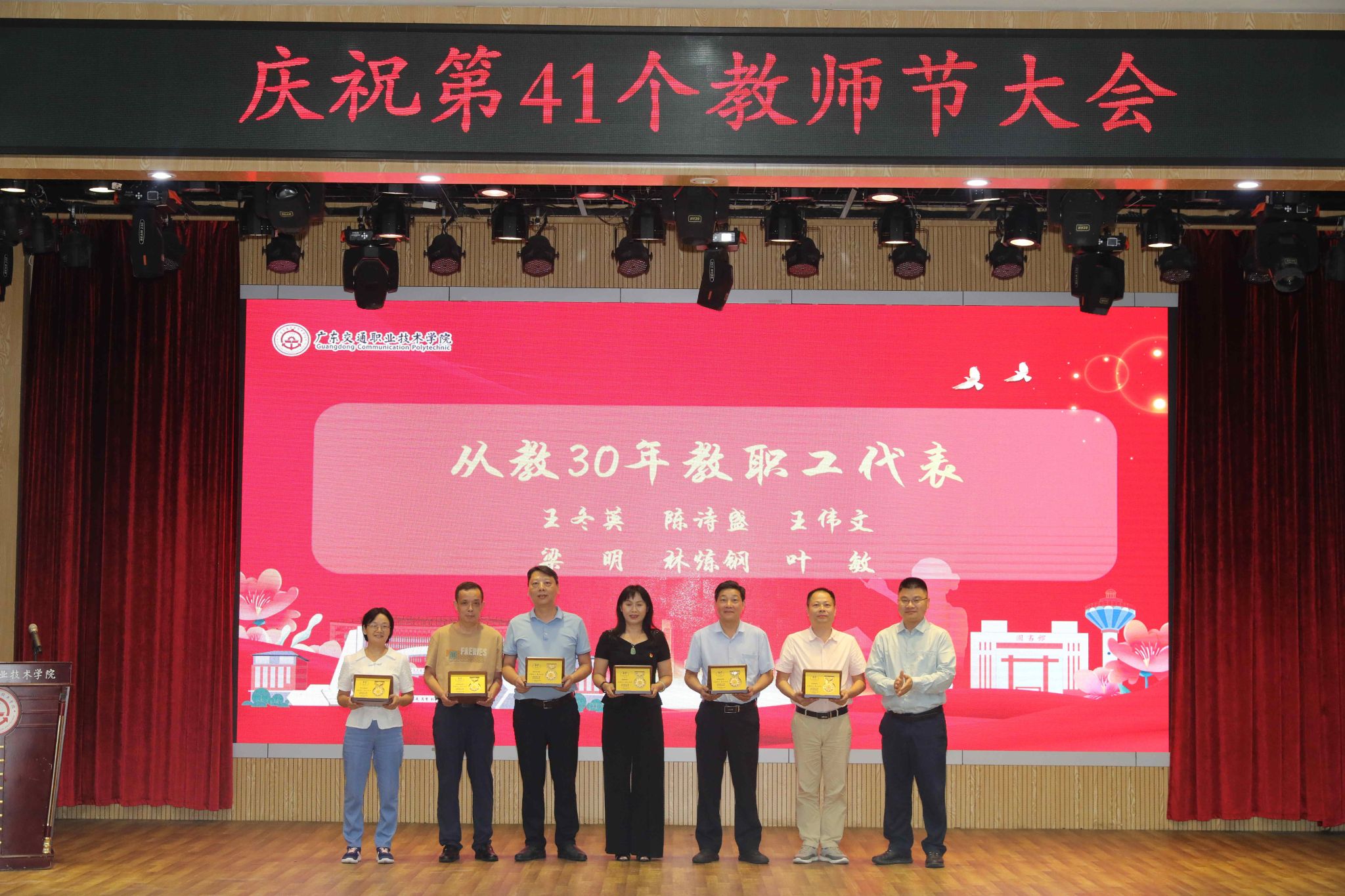 随后举行的教师荣休仪式和从教30年表彰仪式将大会气氛推向高潮。学院领导为杨志伟、朱东华等荣休教师代表颁发857体育的荣誉证书,为梁明、王冬英等从教30年的教职工代表颁发纪念品,致敬他们数十载如一日的坚守与奉献。杨志伟寄语青年教师不忘教育初心,传承师者精神。荣休教师为新进教师佩戴校徽,将“新时代交通精神”“铺路石品格 航标灯精神”的广交职院价值观传承至新进教师。新进教师代表庄严宣誓,铿锵誓言展现了新一代广交职院教师投身教育事业的坚定决心。