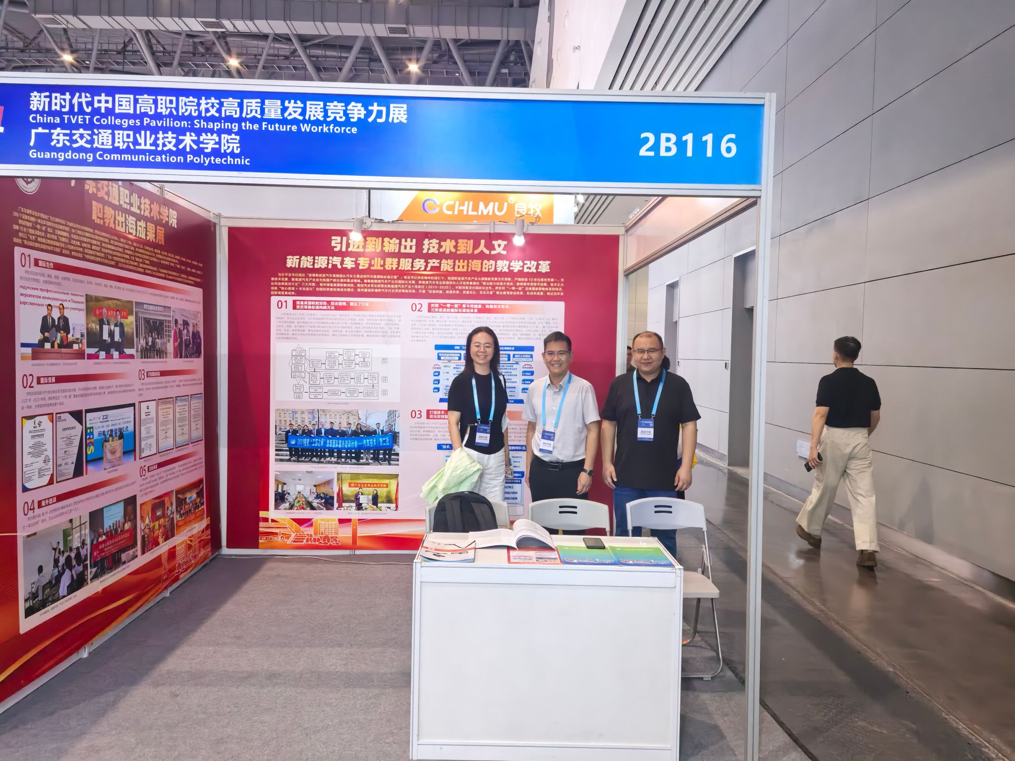 会议期间,广交职院在展会核心区域设立了“新时代中国高职院校高质量发展竞争力展”专题展台,集中展示了学院近年来在国际化办学,特别是“新能源汽车专业群服务产能出海的教学改革”方面所取得的显著成果。展览以“从技术到人文”为脉络,系统呈现了广交职院在课程体系建设、技术技能人才培养、校企协同出海等方面的创新实践,吸引了大量与会兄弟院校、国际嘉宾及行业企业代表驻足参观、交流学习,获得了广泛好评。