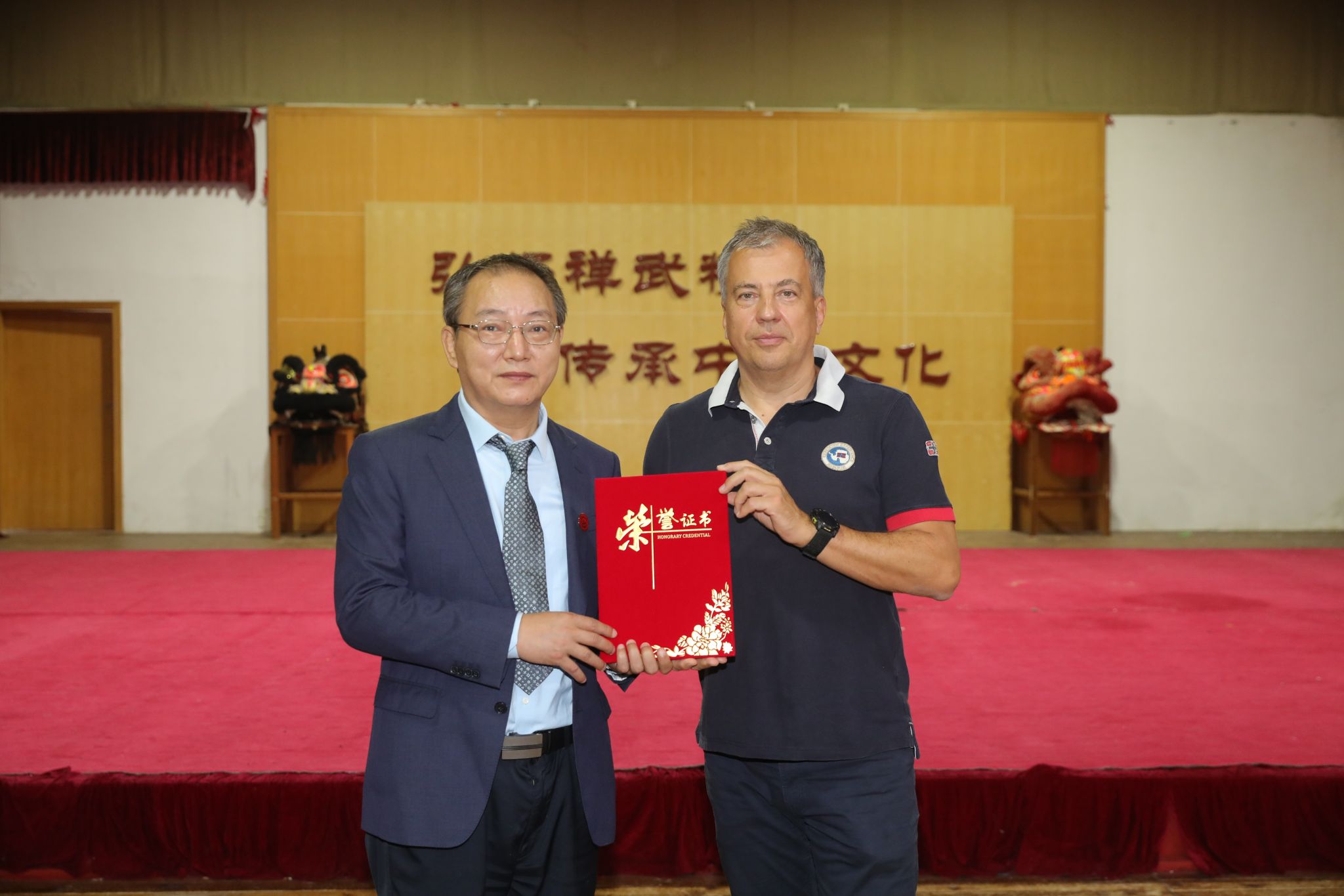 在欢迎仪式上,嘉宾们观看了精彩的禅武功夫表演,亲身体验了中国传统文化的独特魅力。罗毅代表学院向欧拉·劳约什颁发“友谊使者”证书,表彰他为促进中匈友好关系和文化交流作出的卓越贡献。